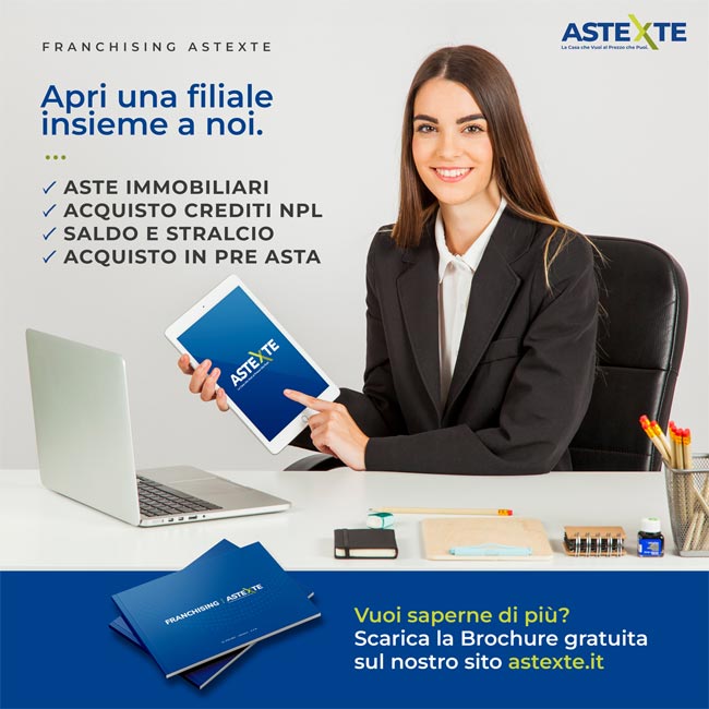 Entra nel settore in forte espansione delle aste immobiliari, crediti deteriorati (NPL) e saldo & stralcio. AstexTe ti permette di diventare consulente in materia e ti offre formazione strutturata, software gestionale, supporto legale e commerciale. Investimento sostenibile con bacino clienti ampio e modello di business ad alta redditività.